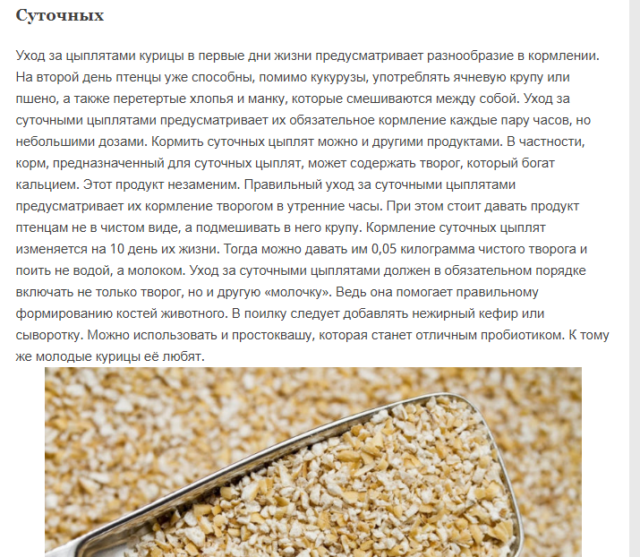 Potraviny by mali byť vyvážené. Kurčatá potrebujú z hľadiska výživy rovnaké jedlo ako človek. Vzhľadom na osobitosť krmiva, doplnkových látok v krmivách, ich kombinácie, indikácií a kontraindikácií. Nemôžete kombinovať dohromady, tvaroh a zeleninu. V tomto prípade je potrebné striedať prísady. Jedného dňa tvarohový doplnok a na druhý iba zelený. Je to potrebné, aby sa kurčatá nedotkli.