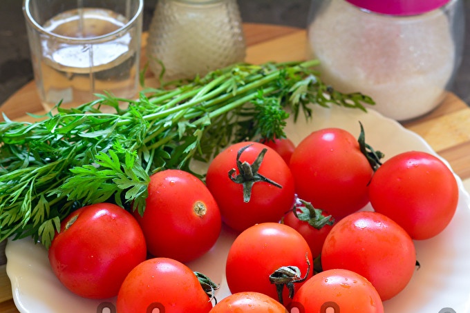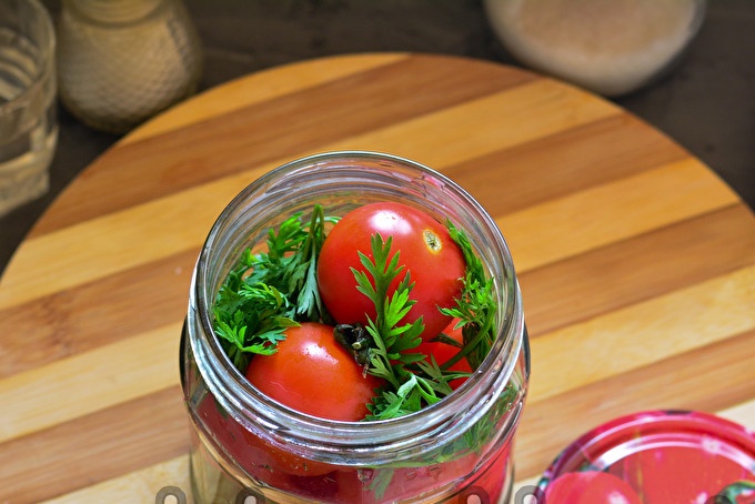 Dajte paradajky do hustej vrstvy. Je lepšie, keď sú rajčiaky malé, ľahko sa distribuujú do pohára.