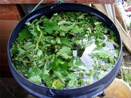 Nádobu prikryte vekom, nechajte obsah stáť 8-10 dní. Zloženie sa zriedi vodou: na vedro s vodou - 1 - 2 poháre infúzie. Naneste na koreňový a listový vrchný dresing.