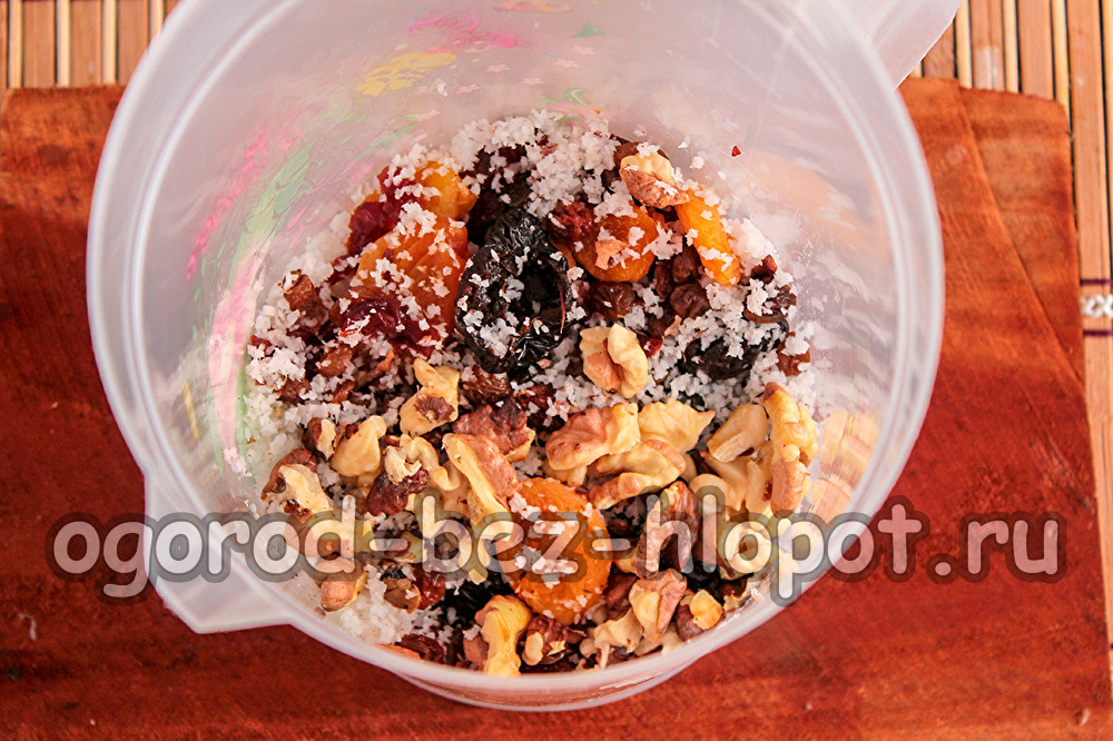 Do misky mixéra alebo vysokej pohára nalejte hrozienka, sušené marhule, sušené slivky, olúpané orechy a kokosové vločky. Alebo použite mlynček na mäso.