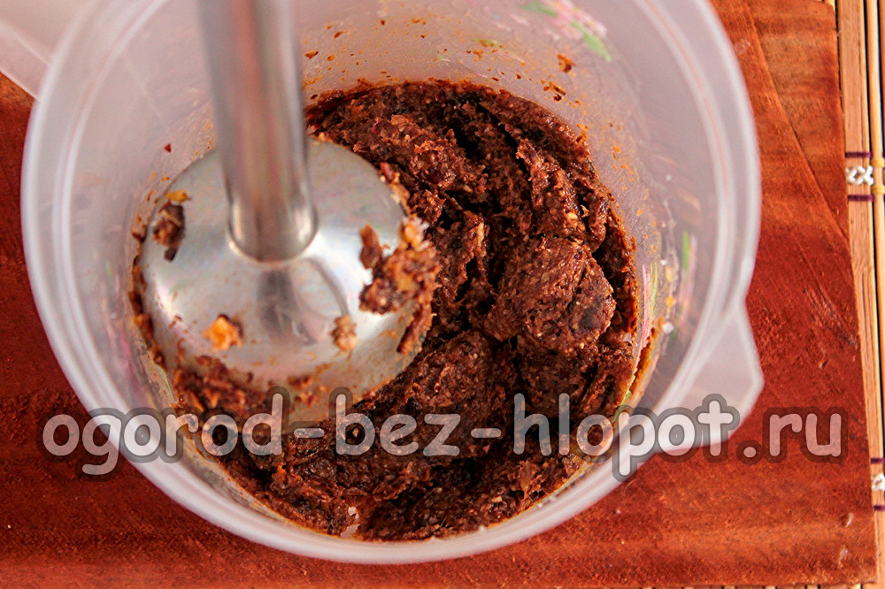 Rozdrvte na hustú kašu s malými kúskami ovocnej drene a orechmi. Ochutnávame to. Stáva sa, že sušené švestky sú veľmi kyslé, takmer bez sladkosti. V tomto prípade pridajte cukor podľa chuti do mletého mäsa.