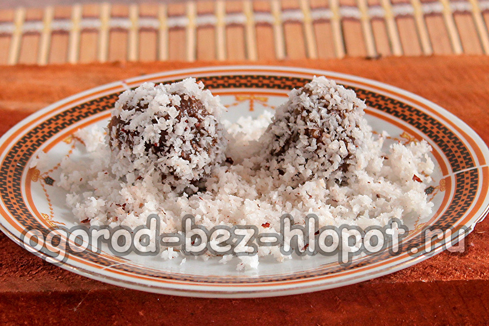 Zoberieme lyžičku výsledného mletého mäsa a valíme malé gule s našimi dlaňami. Rolka v kokosových vločkách (môžete vziať čerstvé kokosové vločky aj sušené kokosové vločky) a hnedý cukor. Ďalšie sladenie nie je pre tieto sladkosti vhodné: kakao preruší chuť a práškový cukor sa roztopí. Sladkosti odstránime v chladničke na pol hodiny alebo hodinu.