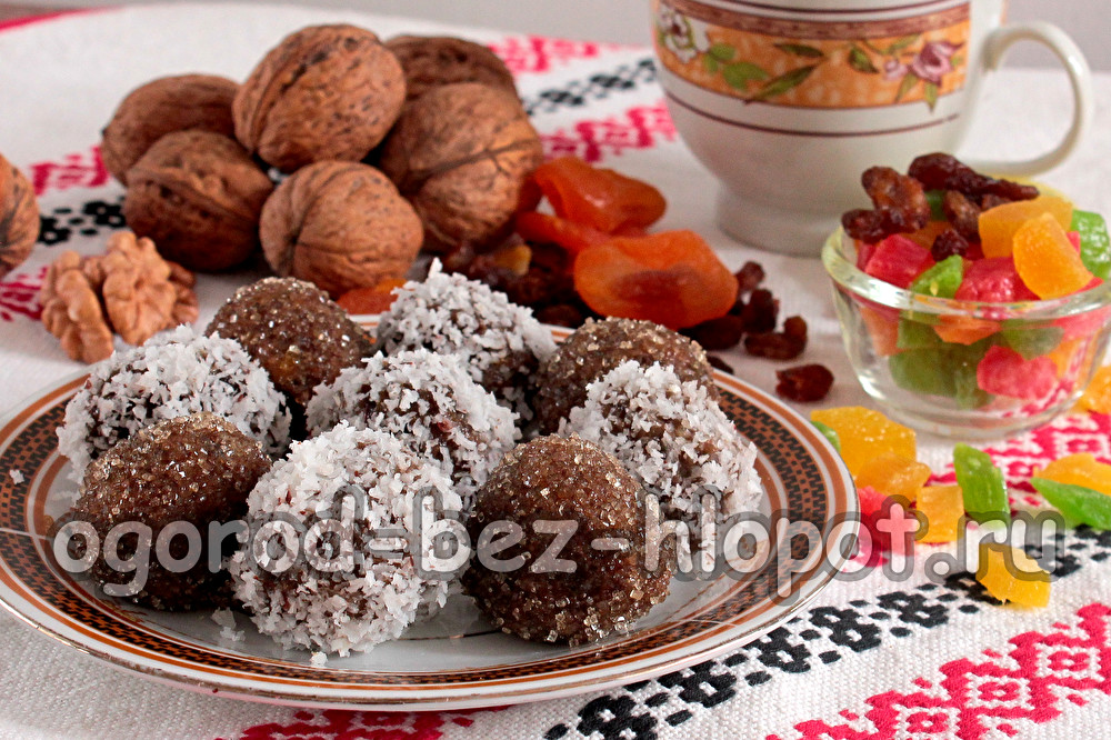 Výber sladkostí v obchodoch je obrovský, pre každý vkus a pre každú udalosť. A zdá sa, prečo strácate čas tým, čo si môžete kúpiť? Kúpte - áno, nie je to problém, iba chuť zakúpených sladkostí je často syntetická, náplň je nasýtená arómami a čokoláda pripomína tmel vôbec. Takéto sladkosti nemôžete nazvať lahodnými ani bezpečnejšími. Ďalšou vecou je cukrovinka varená doma. Presne viete, čo sa k nim pridalo a proporcie sa dajú prispôsobiť vášmu vkusu. Nemusíte však okamžite brať komplexné recepty s dvoma desiatkami ingrediencií, bez ohľadu na to, ako pôsobivý vyzerá hotový dezert. Najskôr pripravte chudé sladkosti zo sušeného ovocia a orechov. Pripravujú sa podľa tohto podrobného receptu s fotografiami rýchlo, z prírodných dostupných produktov sa ukazujú byť veľmi chutné a chutné.