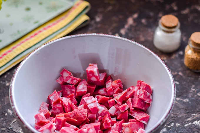 Pripravte všetky produkty zo zoznamu. Vyberte si kvalitnú klobásu, nakrájajte na malé kúsky a poslať klobásu do šalátovej misy.