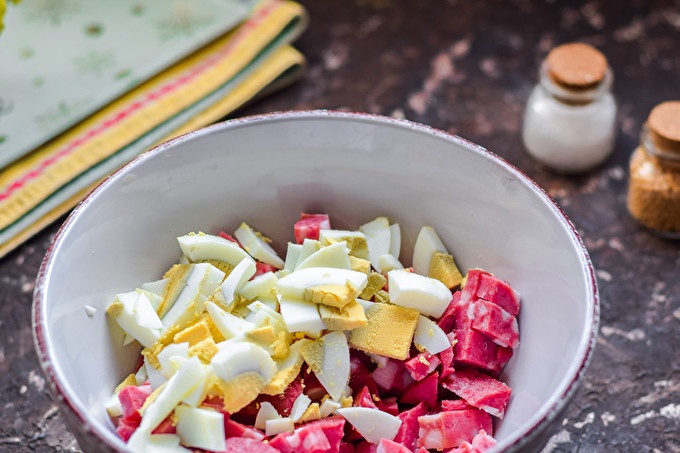 Vajce uvaríme a ošúpeme z škrupiny. Nakrájajte vajíčko na malé slamky a posuňte plátky do šalátovej misy.