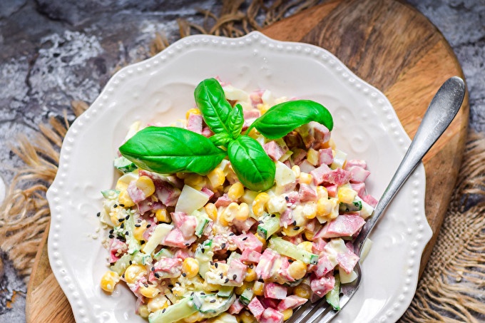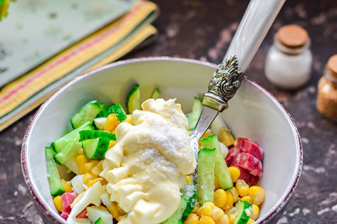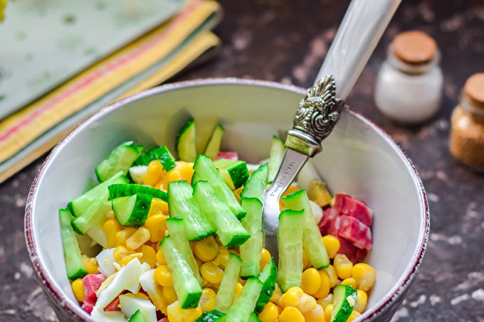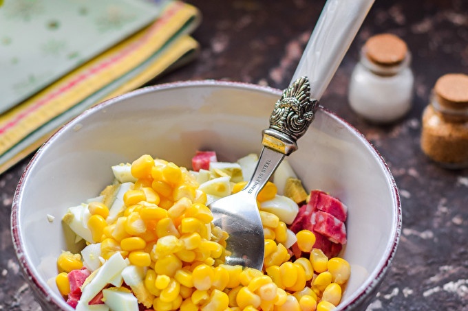 Ako variť šalát "Slama" s kukuricou a klobásou