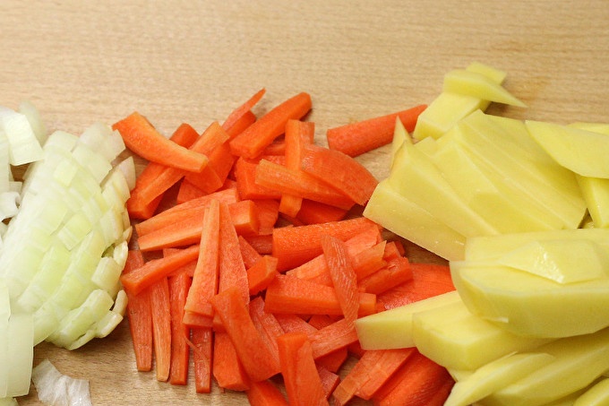 Kým sa voda alebo vývar zahreje do varu, nakrájame mrkvu, zemiaky a cibuľu na kúskovú kocku.