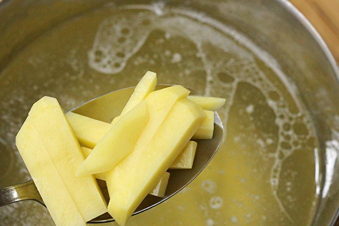 Vložte zemiaky do vriacej vody / vývaru, pridajte trochu soli a počkajte, kým sa nezačne vrieť. Teplo upravte tak, aby bol bod varu slabý. Nechajte variť, kým nie sú pripravené / mäkké zemiaky.