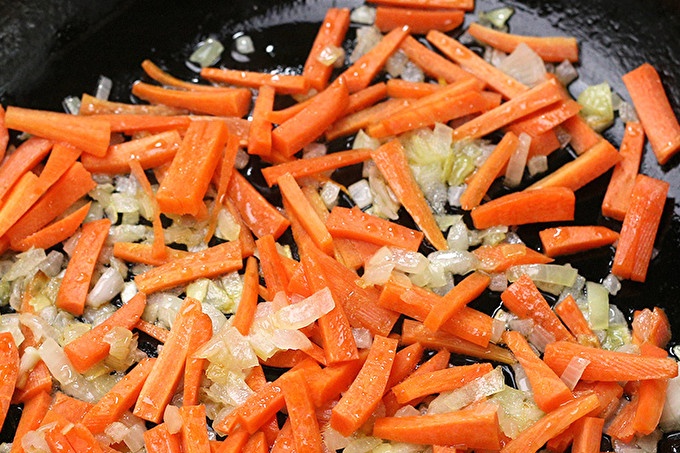 Na panvici s horúcim olejom prejdite na priesvitný luk. Pridajte mrkvu, prikryte a povarte ju päť až sedem minút.