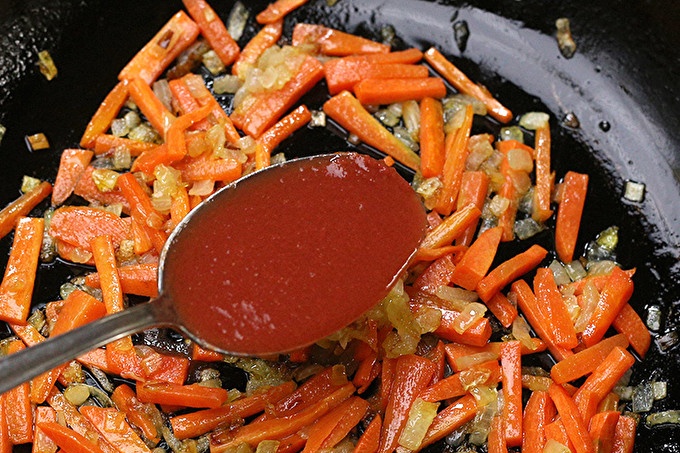 Do zmäknutej zeleniny pridajte hustú paradajkovú omáčku. Mix, mierne zvýšiť oheň na smaženie paradajok, dať pečené bohatú kyslou chuť.