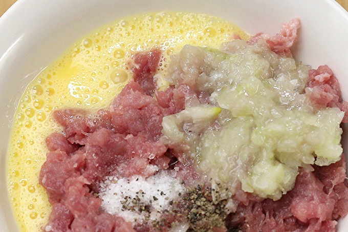 Keď je zelenina vyprážaná, uvarte mleté mäsové gule. Pridajte mletú cibuľu, rozdrvené vajíčko, soľ a korenie na mäso alebo kuracie kúsky. Všetko starostlivo premiešame.