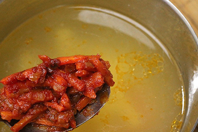 Pridajte vývar z paradajok a zeleniny do vývaru s hotovými zemiakmi.