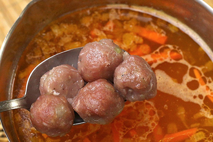 Uvádzanie mäsových guličiek do vriacej polievky. Miešajte tak, aby sa nelepilo na dno, a varte takmer dovtedy, kým nie sú mäsové gule pripravené (8-10 minút).